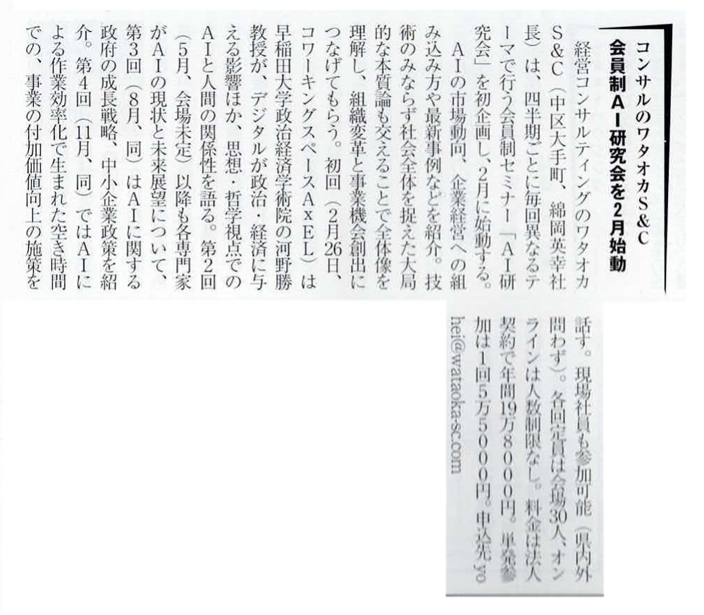 2026年01月28日 「広島経済レポート」(1月29日号)に弊社主催「AI研究会」の記事が掲載されました! この度、弊社が主催する「AI研究会」について、「広島経済レポート」(1月29日号)に記事掲載されました! ぜひ、ご覧くださいましたら、幸いです。 現在、引き続き、会員を絶賛募集中です!皆様のご参加お待ちしております! 少しでも興味がございましたら、取締役の綿岡洋平(yohei@wataoka-sc.com)まで、ぜひお気軽にお問い合わせください。 ※自社記事のみの掲載は許可されております。 « 前の記事へ 一覧を見る