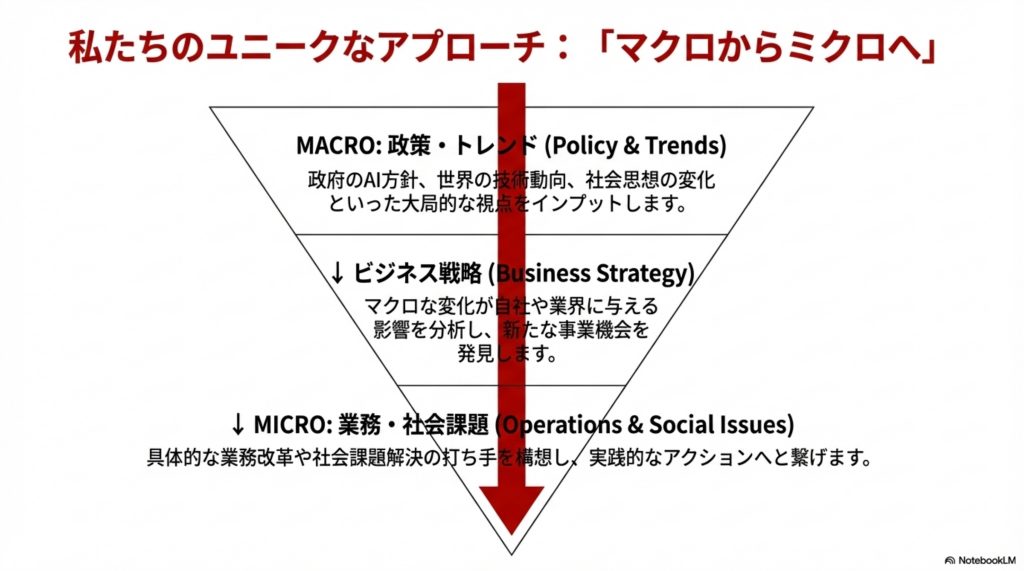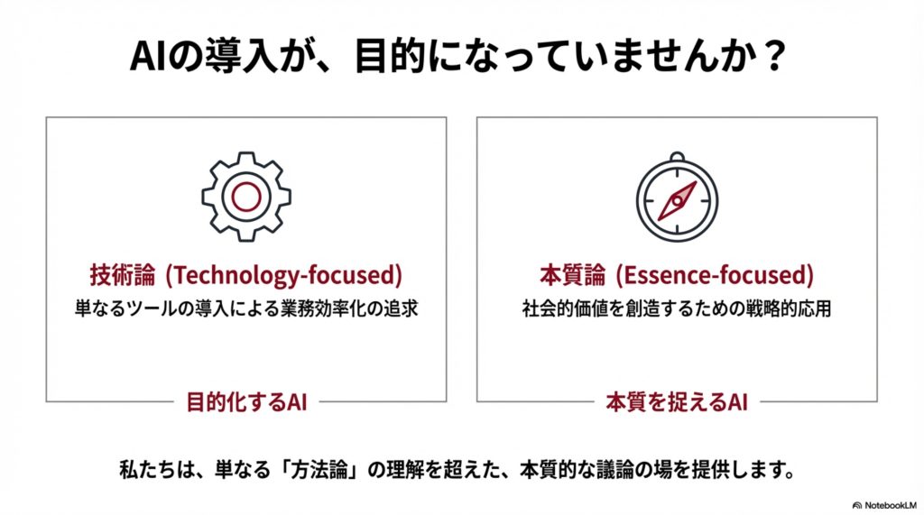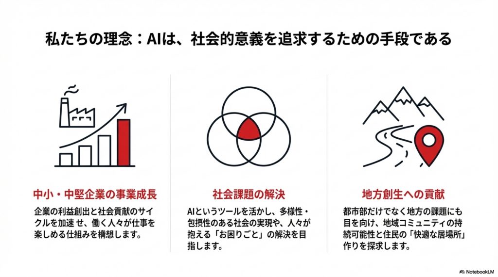 AIの技術論(活用術など)はもちろん重要であることは前提として、もっとAIの「本質論」(手段としてのAI、社会への影響、社会課題解決など)を考えるべきであるとのコンセプトを基本に、イベントなどのコンテンツのご提供をいたします。