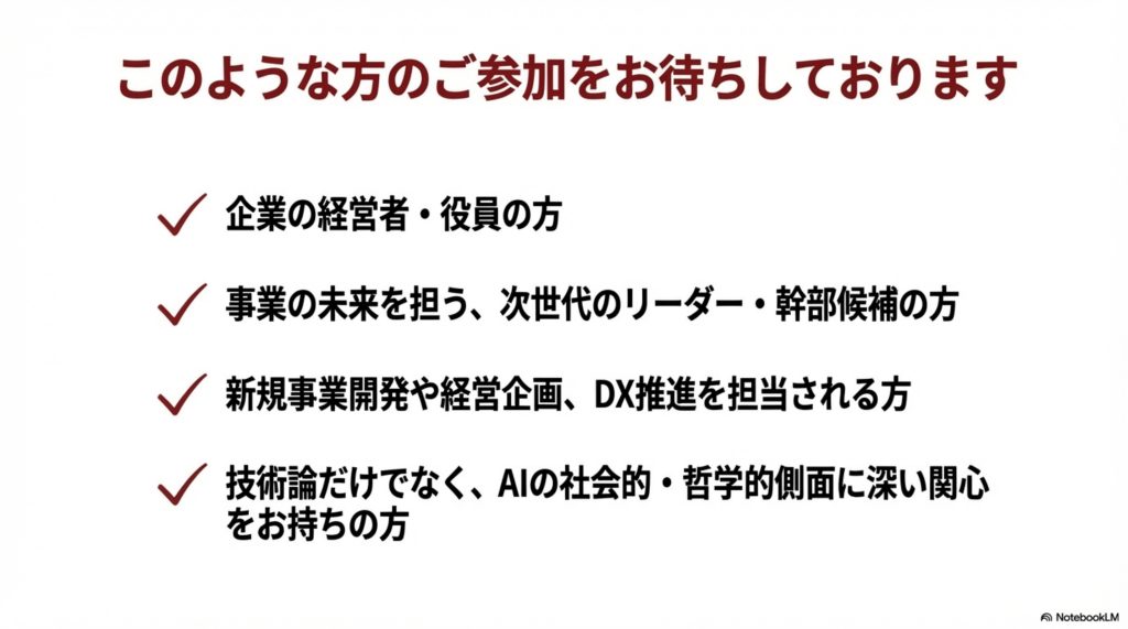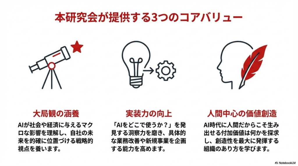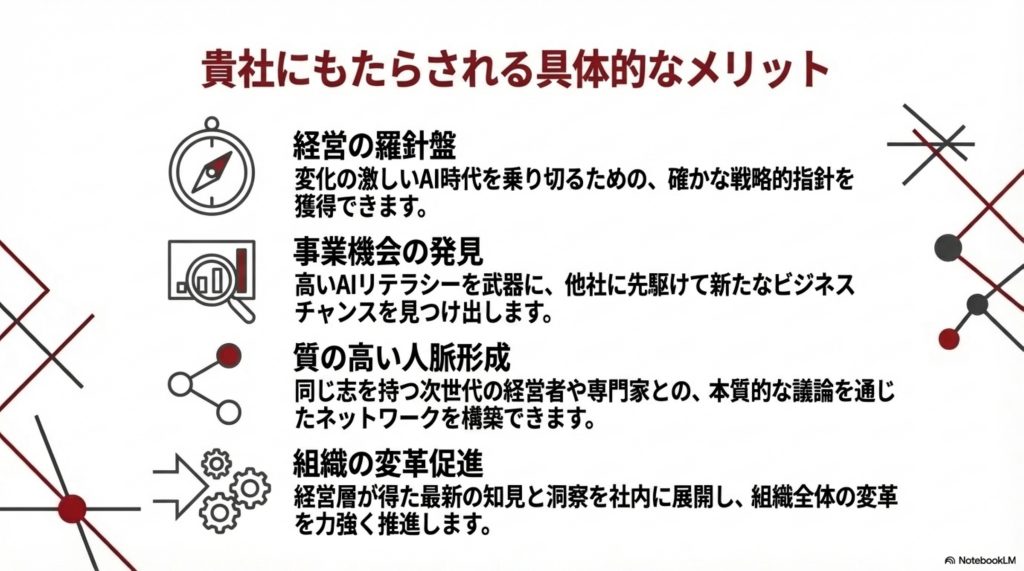 最近は、数多くの経営者の方がAI活用の優劣で企業の優勝劣敗が決まると認識をしており、AIの本格的活用について、数多くのご要望等をお寄せいただいており、AIの本質的を捉えること、そして全社的にAI活用していくことで、早期経営改革につながるとの考えで、発足する事になりました。