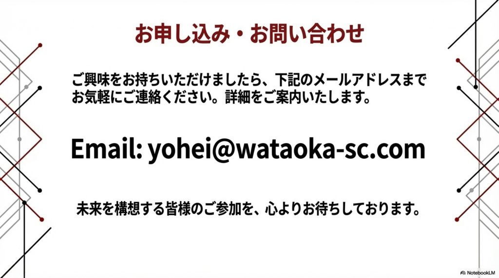 ぜひ、ご覧いただきまして、少しでもご興味がある方がいらっしゃいましたら、取締役の綿岡洋平(yohei@wataoka-sc.com)まで、メールでお問い合わせ、お申し込みください。