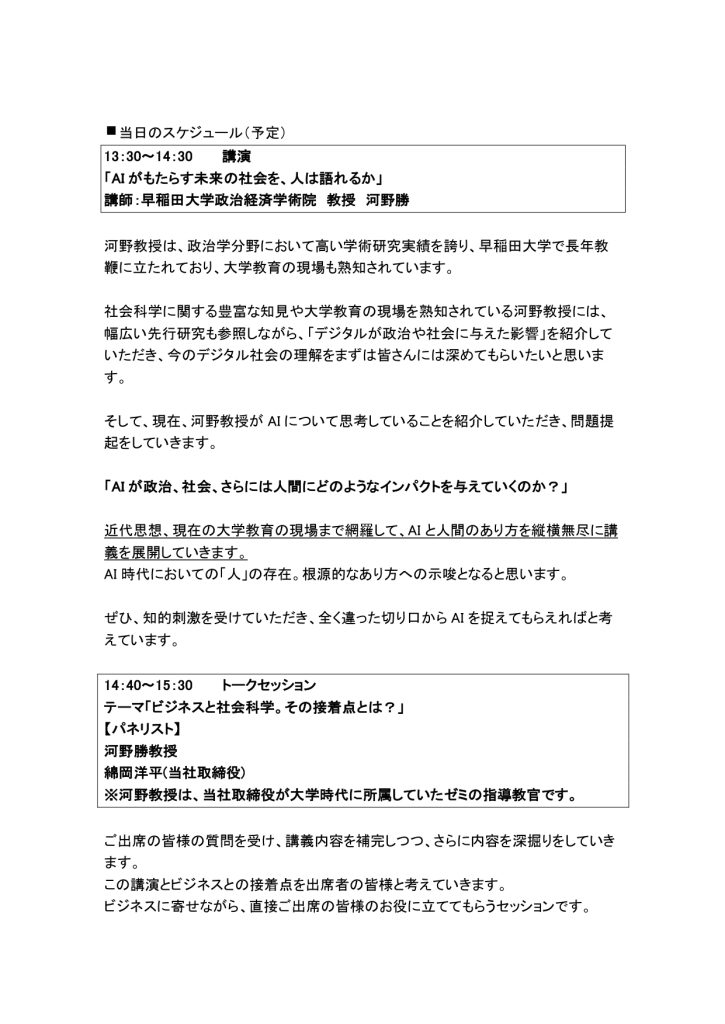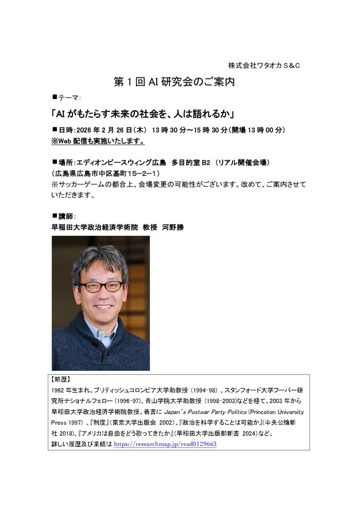 第1回AI研究会イベントとして、会員様のみを対象に、早稲田大学政治経済学術院の河野勝教授をゲストスピーカーにお迎えし、「AI がもたらす未来の社会を、人は語れるか」と題して、2026 年 2 月 26 日(木) 13 時 30 分〜15 時 30 分で講演とトークセッションを開催いたします。